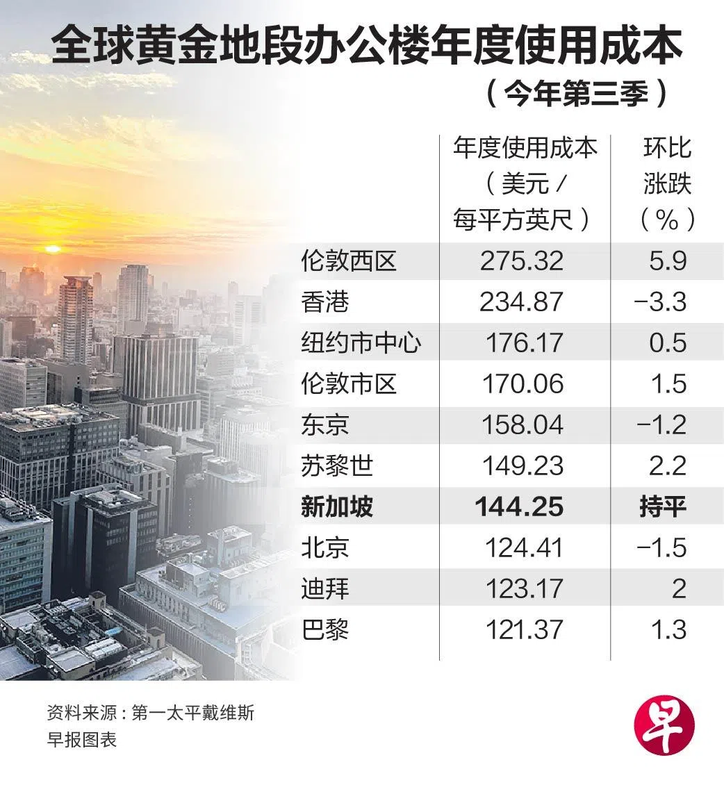 第一太平戴维斯(Savills)近日发布全球黄金地段办公楼使用成本报告,今年第三季新加坡黄金地段办公楼的使用成本为每平方英尺144.25美元(约198新元),环比持平。最昂贵的是伦敦西区,环比飙增5.9%至275.32美元,第二昂贵的香港则环比下跌3.3%至234.87美元。