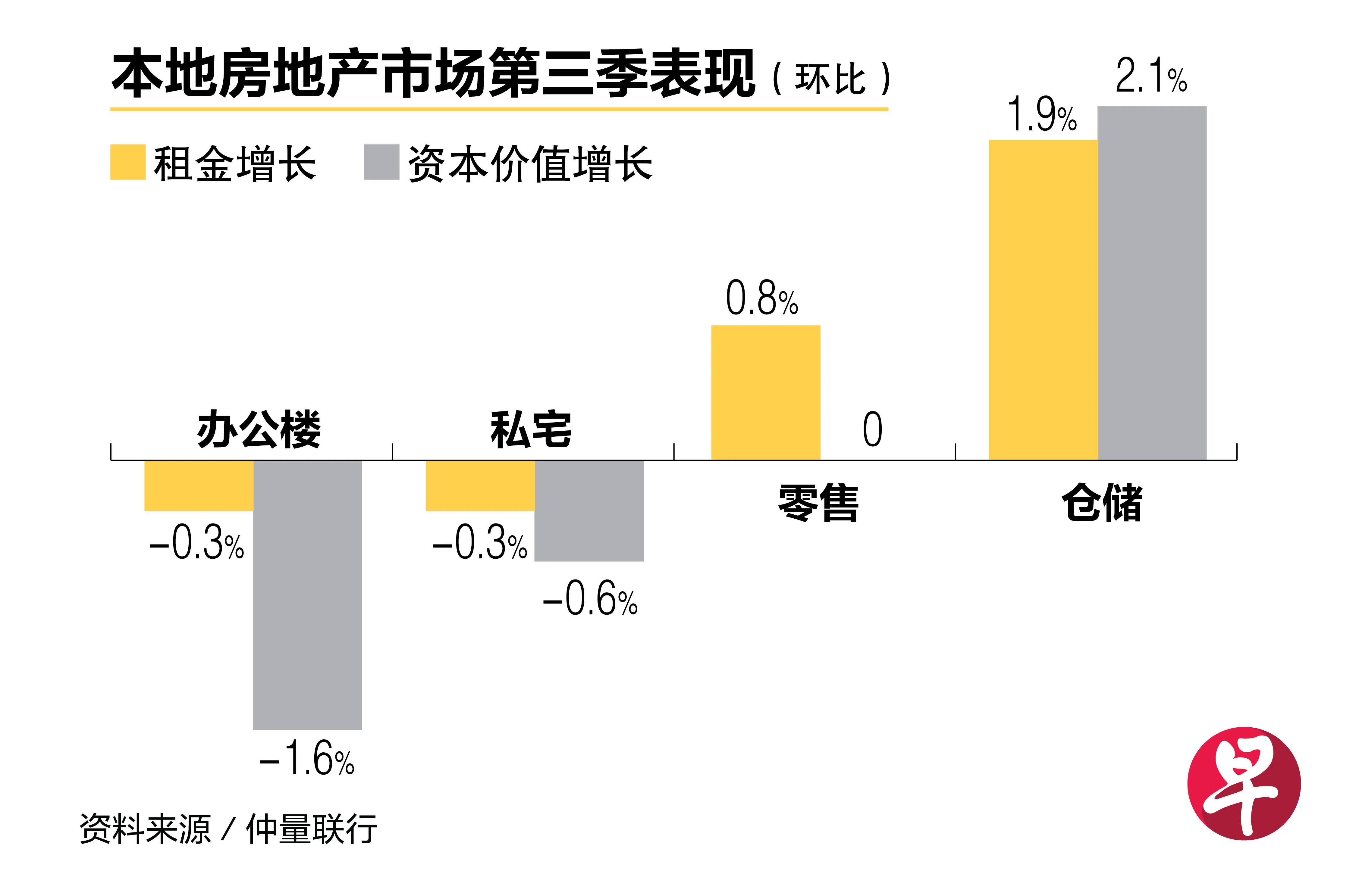 供应持续紧张和投资者需求保持良好,本地仓储空间平均租金和资本价值连续10个季度增长,今年第三季分别增长1.9%和2.1%。