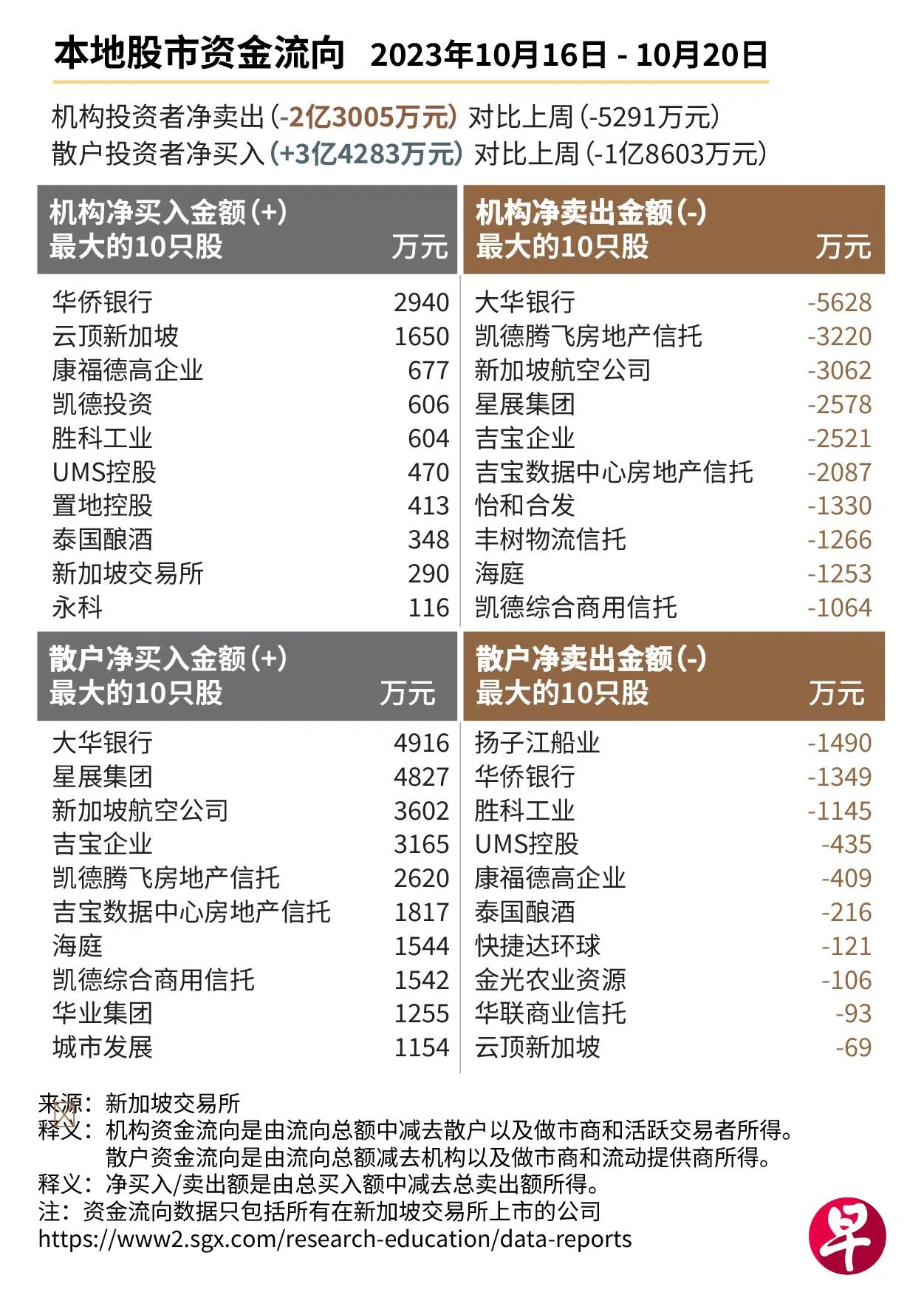 新加坡交易所数据显示,机构投资者在上周净卖出2亿3005万元的股票,其中卖出最多股票的是大华银行(UOB),达5628万元。买入金额最大的机构投资者是华侨银行(OCBC),达2940万元。