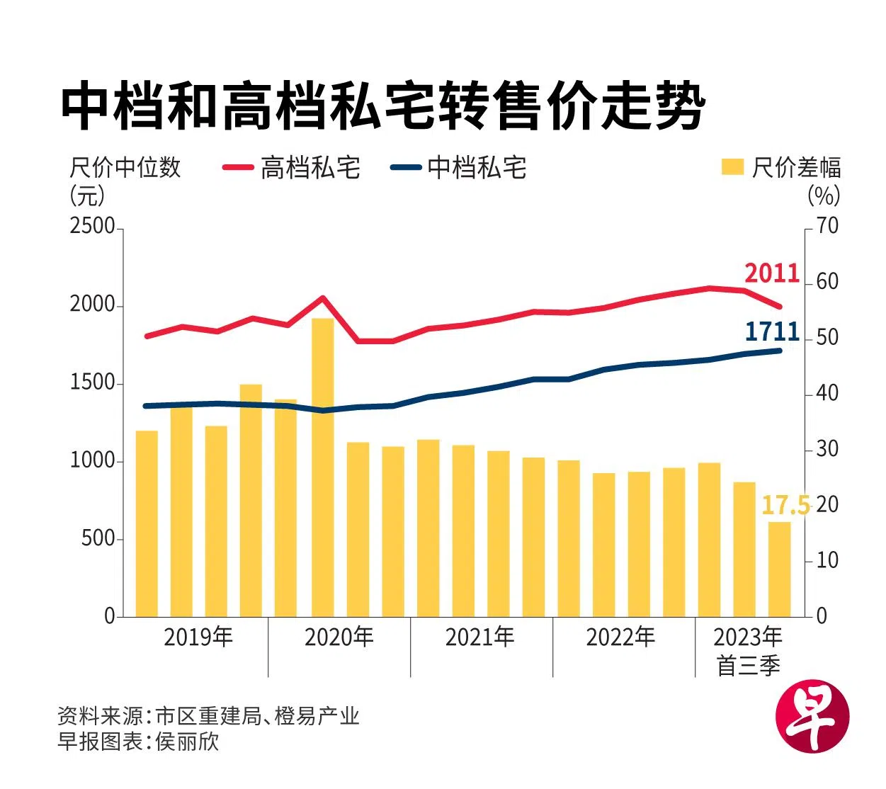 高档私宅和中档私宅的尺价差距不断收窄,从今年第一季的27.5%跌至第二季的24.1%,再滑落到第三季的17.5%,稍微高于2001年第三季的14.5%差幅。