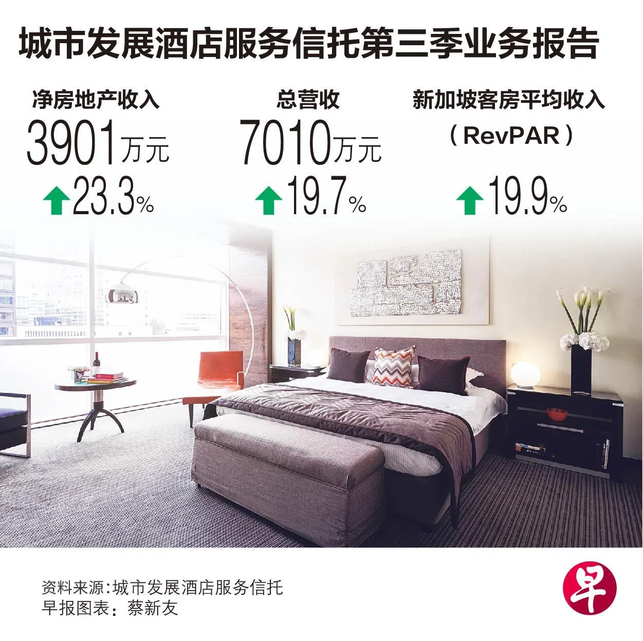 在国际旅游业复苏的推动下,城市发展酒店服务信托(CDL Hospitality Trusts)第三季净房地产收入同比增长23.3%,达到3901万元;总营收为7010万元,同比增长19.7%,营收一半以上来自位于新加坡的酒店 。