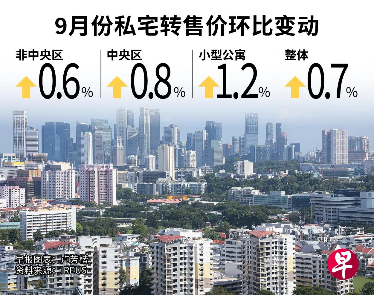 以地区分布来看,不包括小型公寓的非中央区的私宅转售价增长0.6%;不包括小型公寓的中央区私宅转售价,环比增长0.8%;小型公寓转售价则起1.2%。