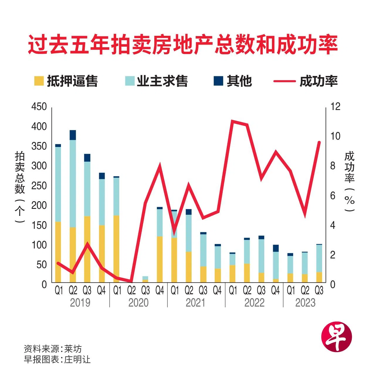 在经济放缓和利率较长时间维持在较高水平的背景下,本地今年第三季的拍卖房地产数量环比增加24.4%至102个,交易额达到1780万元,是第二季480万元的近三倍。