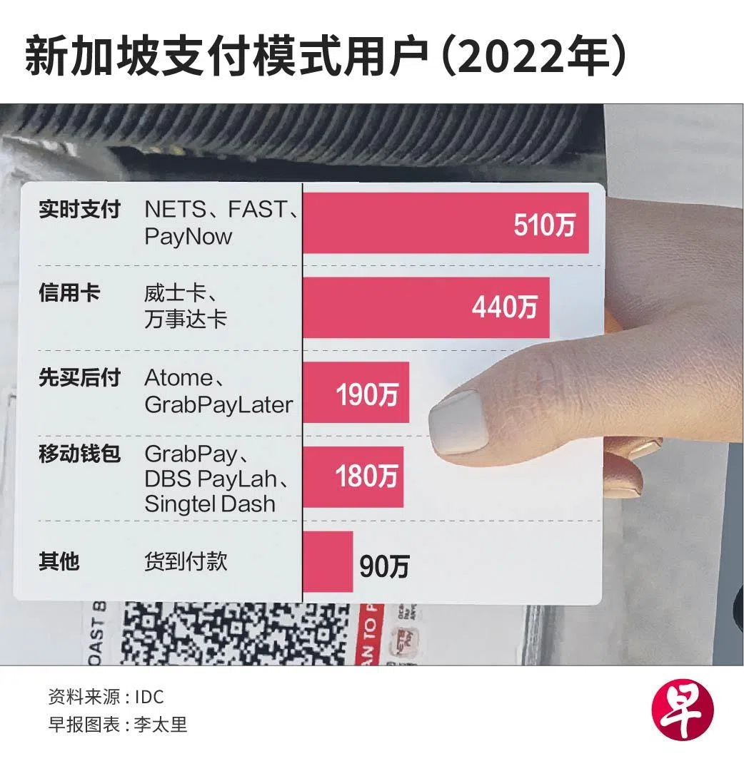 在新加坡,截至2022年,实时支付如NETS、FAST和PayNow有最多人使用,共有510万人,其次是信用卡440万人,先买后付则有190万个用户,而移动钱包有180万人使用。