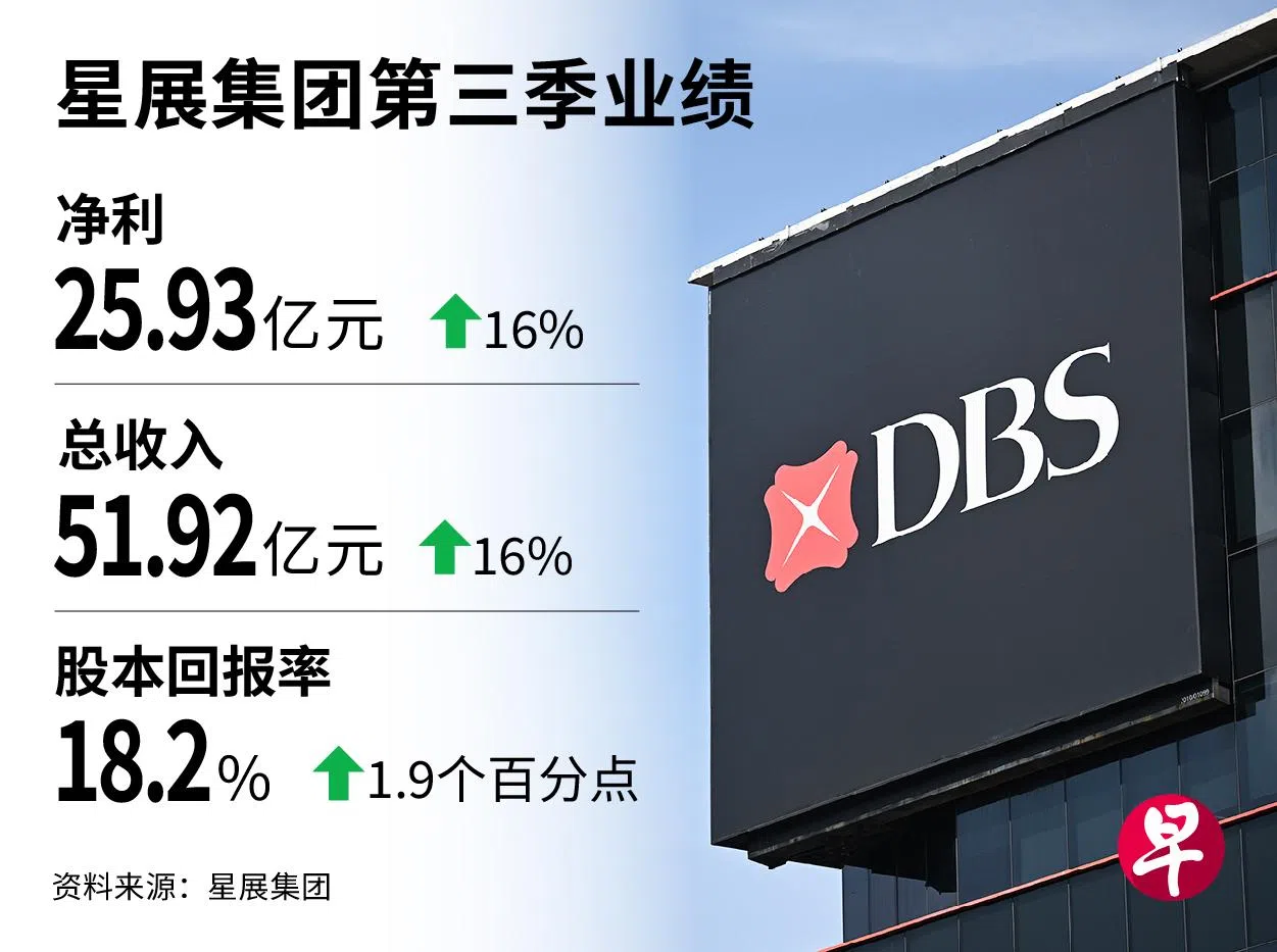 净利息收益率扩张,以及商业账目的非利息收入持续取得增长,推动星展集团(DBS)的第三季总收入同比上升16%至51亿9200万元,净利上升16%至25亿9300万元。