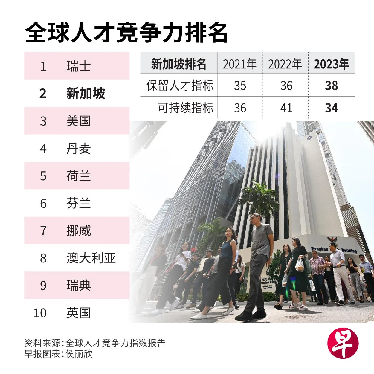 新加坡在吸引和培养人才方面表现卓越,今年在全球人才竞争力排行榜连续三年位居第二,排在瑞士之后。