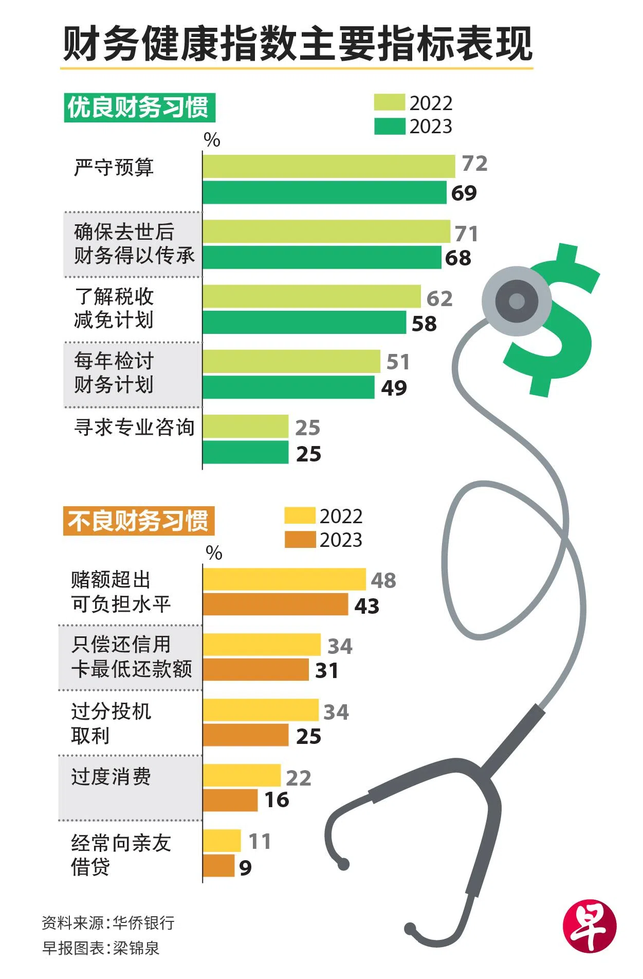 相较去年调查,今年国人不良财务习惯都有所减少,赌博额度超出可负担水平的国人占比从去年的48%下降至43%。只偿还信用卡最低还款额的减少3个百分点至31%。过分投机取利的投资者,从34%大幅降至25%,改善最明显。过度消费的比率也从22%减少至16%,而经常向亲友借贷的比率从11%下滑至9%。