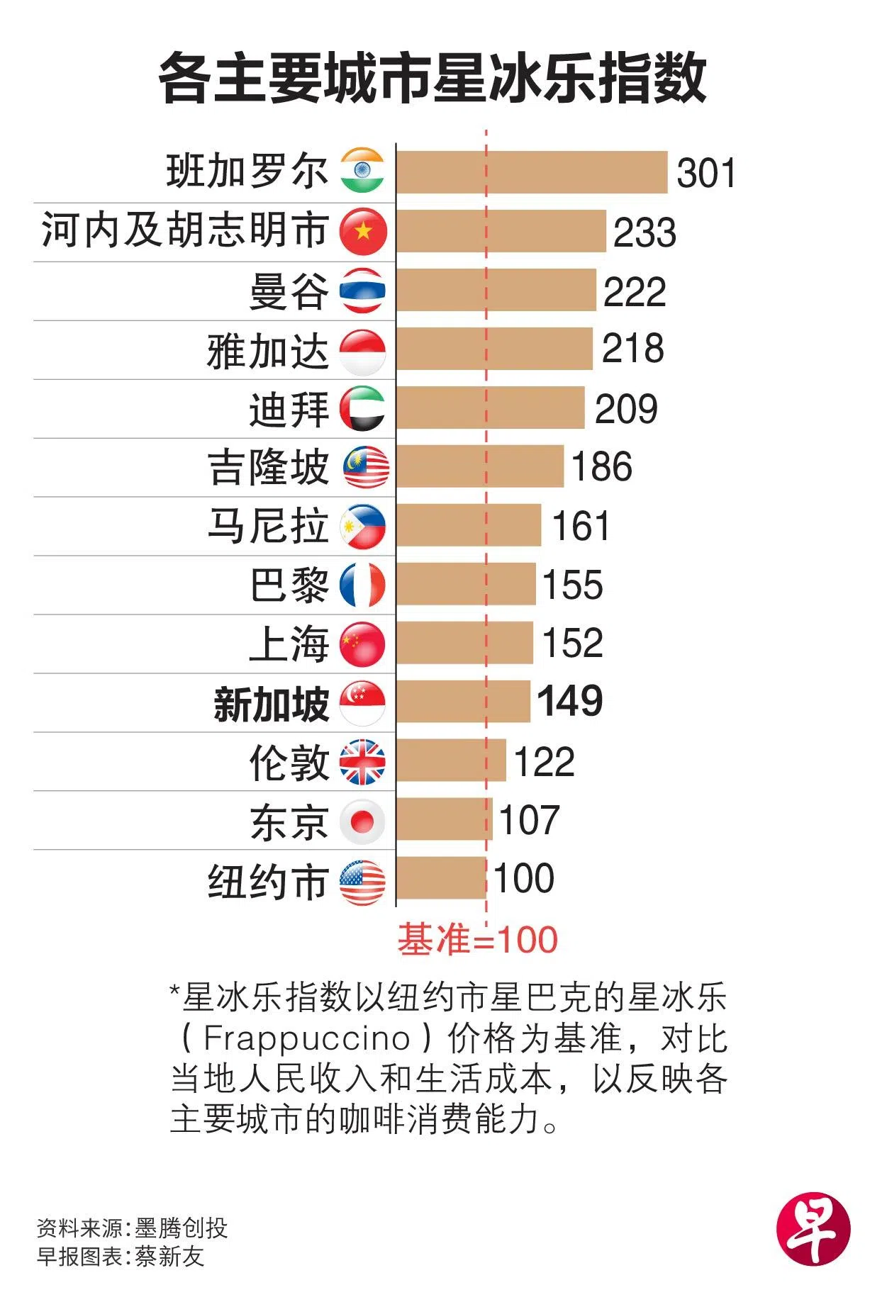 配合东南亚咖啡报告,墨腾创投也推出“星冰乐指数”(Frappuccino Index)。该指数以纽约市星巴克的星冰乐价格为基准,以趣味方式衡量全球主要城市的生活成本和可支配收入,借此反映各主要城市消费者的咖啡购买力。