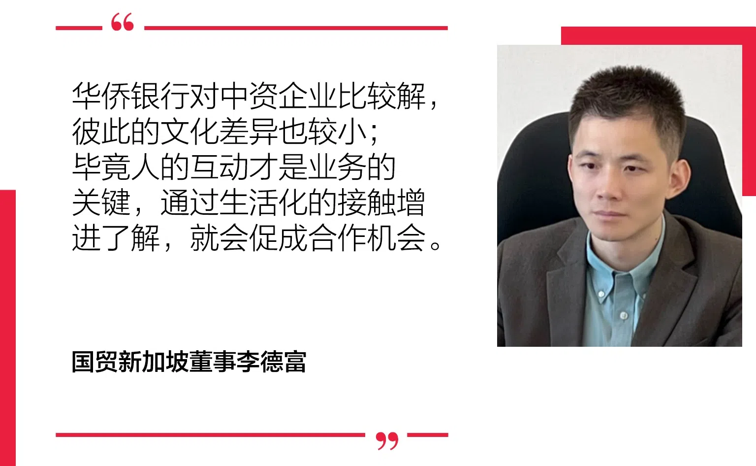 李德富颇有感触地说:“华侨银行对中资企业比较了解,彼此的文化差异也较小;毕竟人的互动才是业务的关键,通过生活化的接触增进了解,就会促成合作机会。”