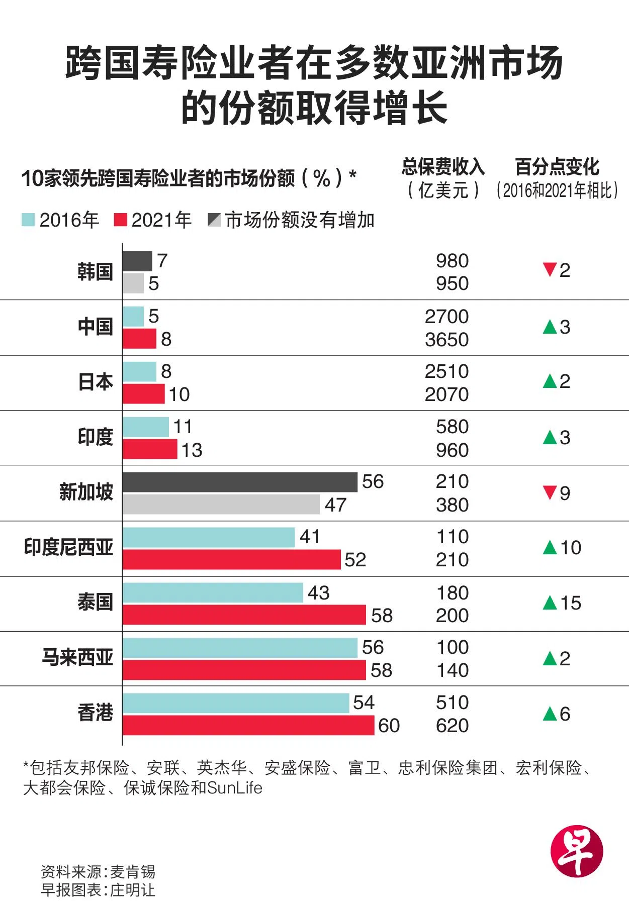 一项最新研究显示,2016年至2021年期间,10家领先跨国寿险业者在亚洲市场的份额普遍增加,韩国和新加坡则下跌。