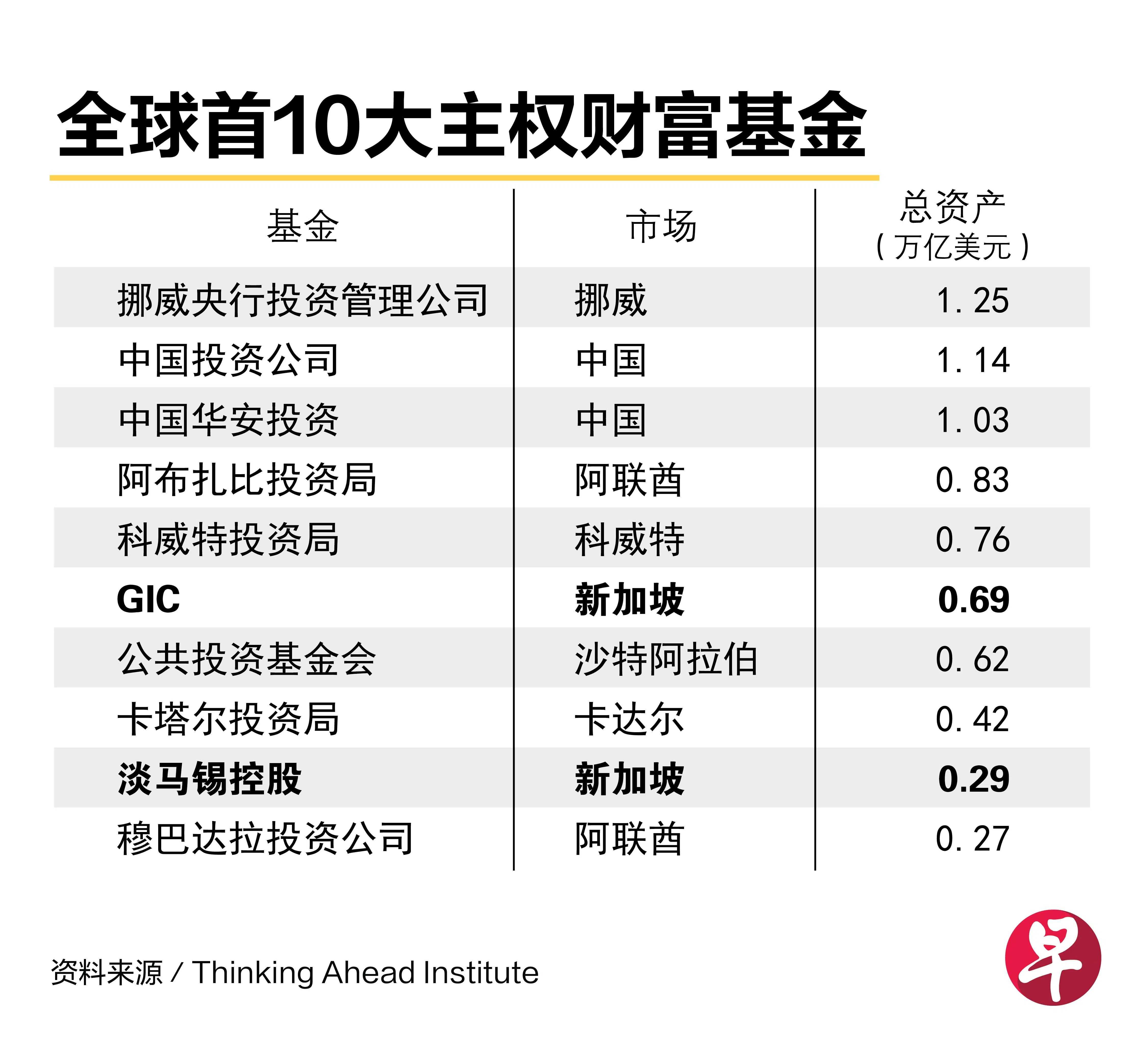 新加坡政府投资公司(GIC)、中央公积金局(CPF)和淡马锡控股(Temasek Holdings)都在全球20大资产所有者排行榜上,分别排名第八、第15和第18。
