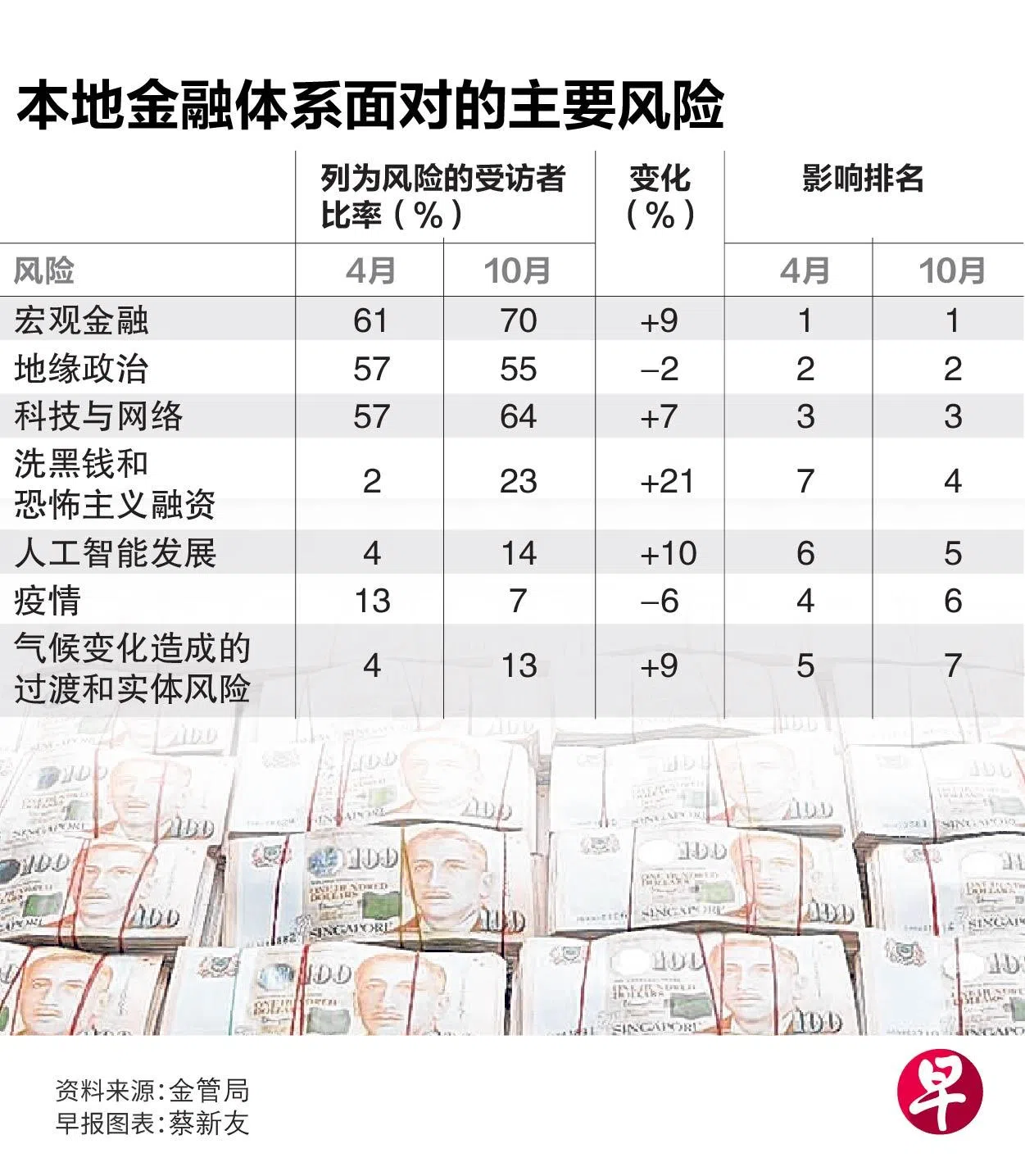 新加坡的金融机构依然视货币政策紧缩为最大风险。一些机构指出,利率持续走高有可能导致信贷风险增加。与此同时,在28亿元洗钱案曝光的背景下,本地金融机构更关注洗钱和恐怖主义融资风险。