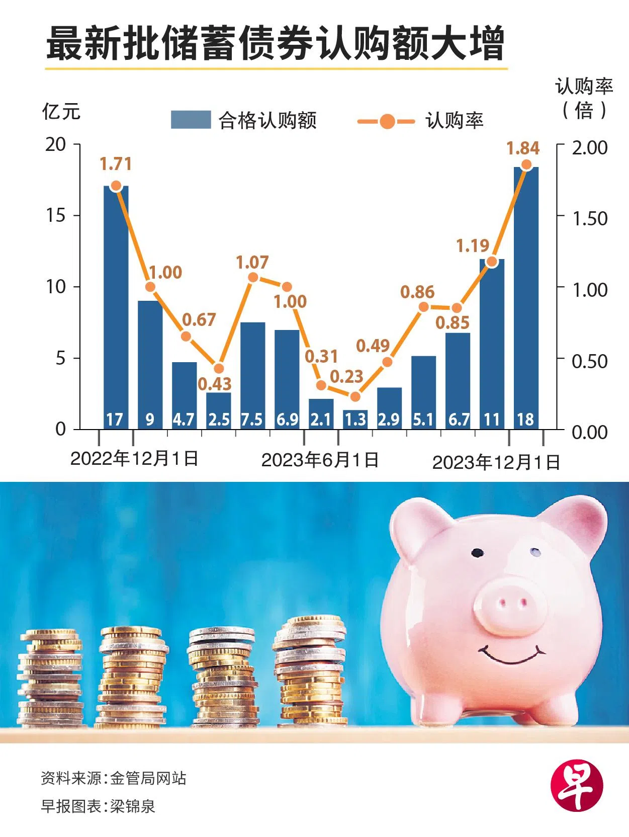 最新一批储蓄债券的高利率吸引众多投资者进场,认购额创一年多来新高,10亿元发行额吸引超过18亿元的认购,是去年11月来的新高。