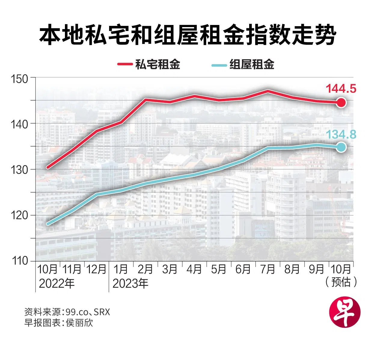 房地产网站99.co和新加坡房地产联合交易网SRX星期三(11月29日)发布的预估数据显示,私宅租金在10月份连续第三个月滑落,但这次的跌幅低于前个月的0.7%跌幅,显示跌势稍有回稳。