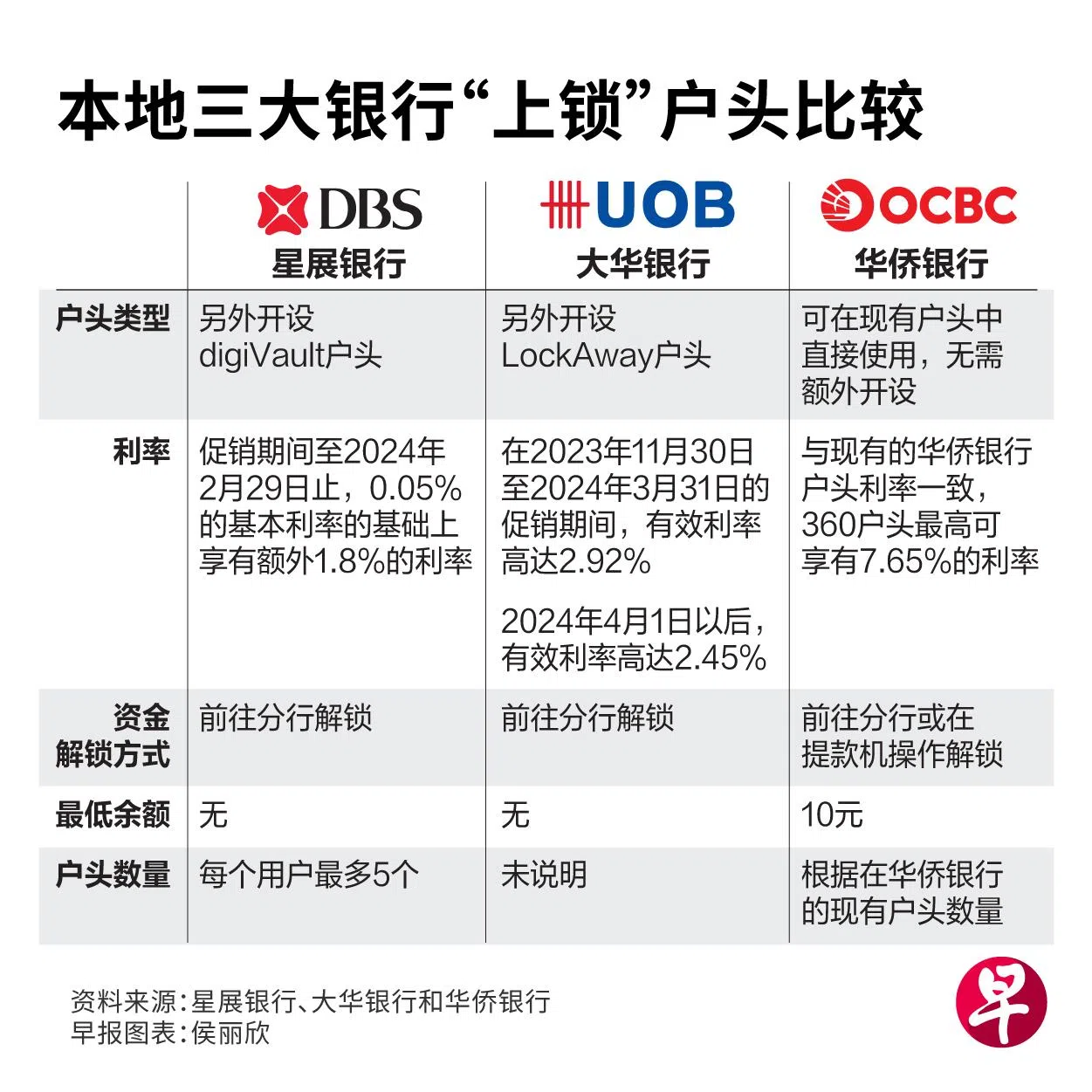 与前两家银行不同,华侨银行(OCBC)的资金锁定功能可在现有户头中直接使用,无须另外开设新户头。客户现有的储蓄户头中锁住的资金与未上锁的资金会加起来,享有相同的利率。