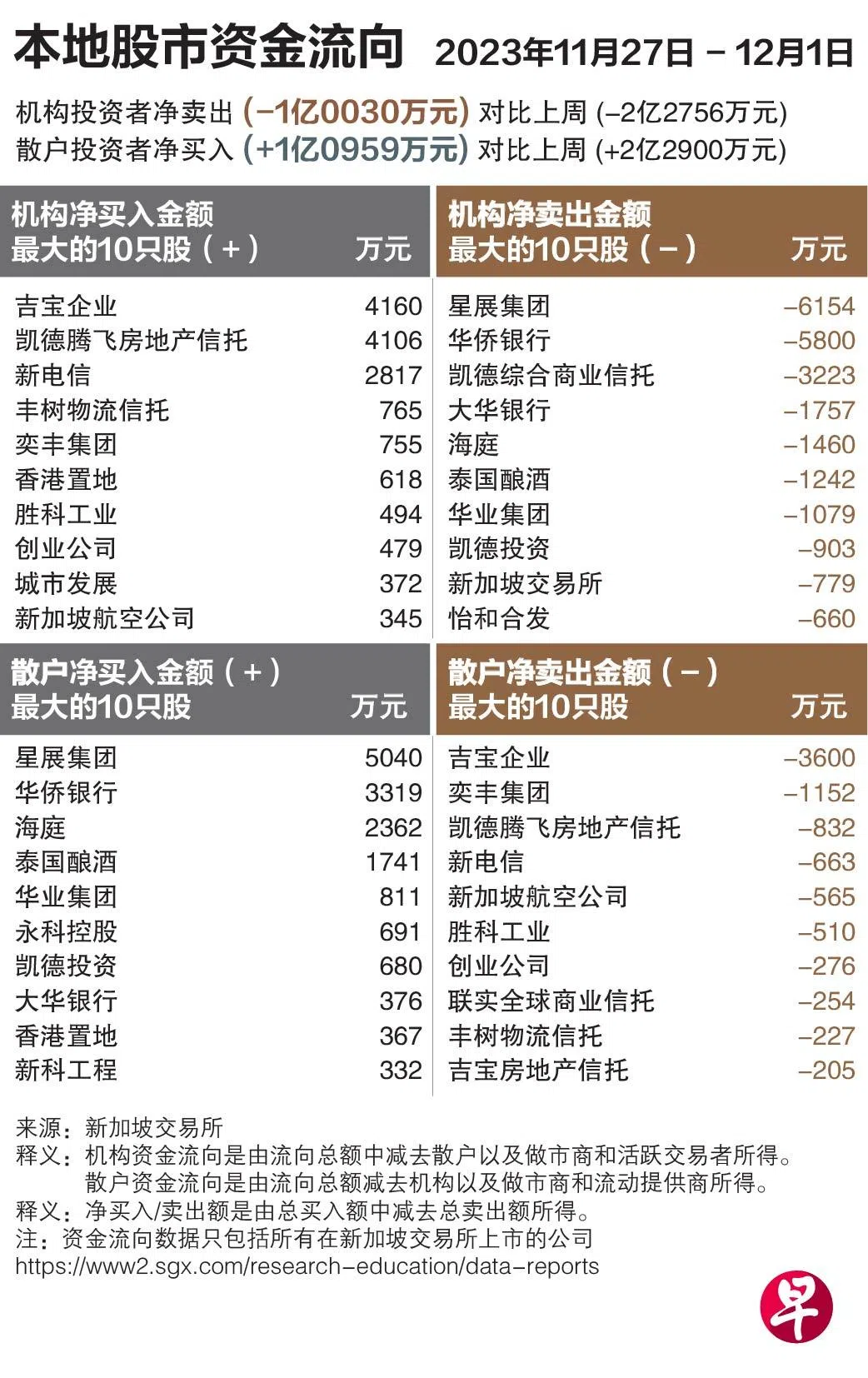 上周,机构投资者总共净卖出1亿零30万元,较前一周减少超过一半。机构投资者净买入最多的是吉宝企业(Keppel Corp),净卖出最多的是星展集团。散户则相反。