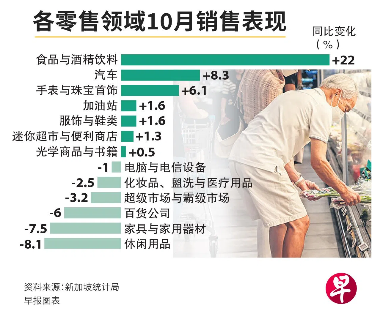 “尽管整体零售销售指数趋缓,但食品与酒精饮料的销售表现最好,同比增长22%。这再次显示新加坡零售业获得国际旅游复苏的支撑。10月份入境我国的旅客虽然少于9月份,但已恢复到2019年10月水平的74%。”