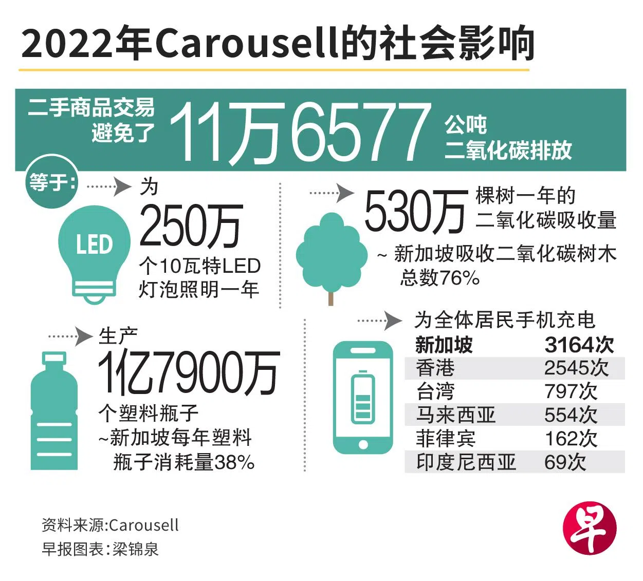 多品类二手交易平台Carousell的时尚与奢侈品、电子产品、家具与家居生活,以及爱好与玩具等四个商品类别的用户,去年一共避免了11万6577公吨的碳排放,相当于530万棵树每年吸纳的二氧化碳。