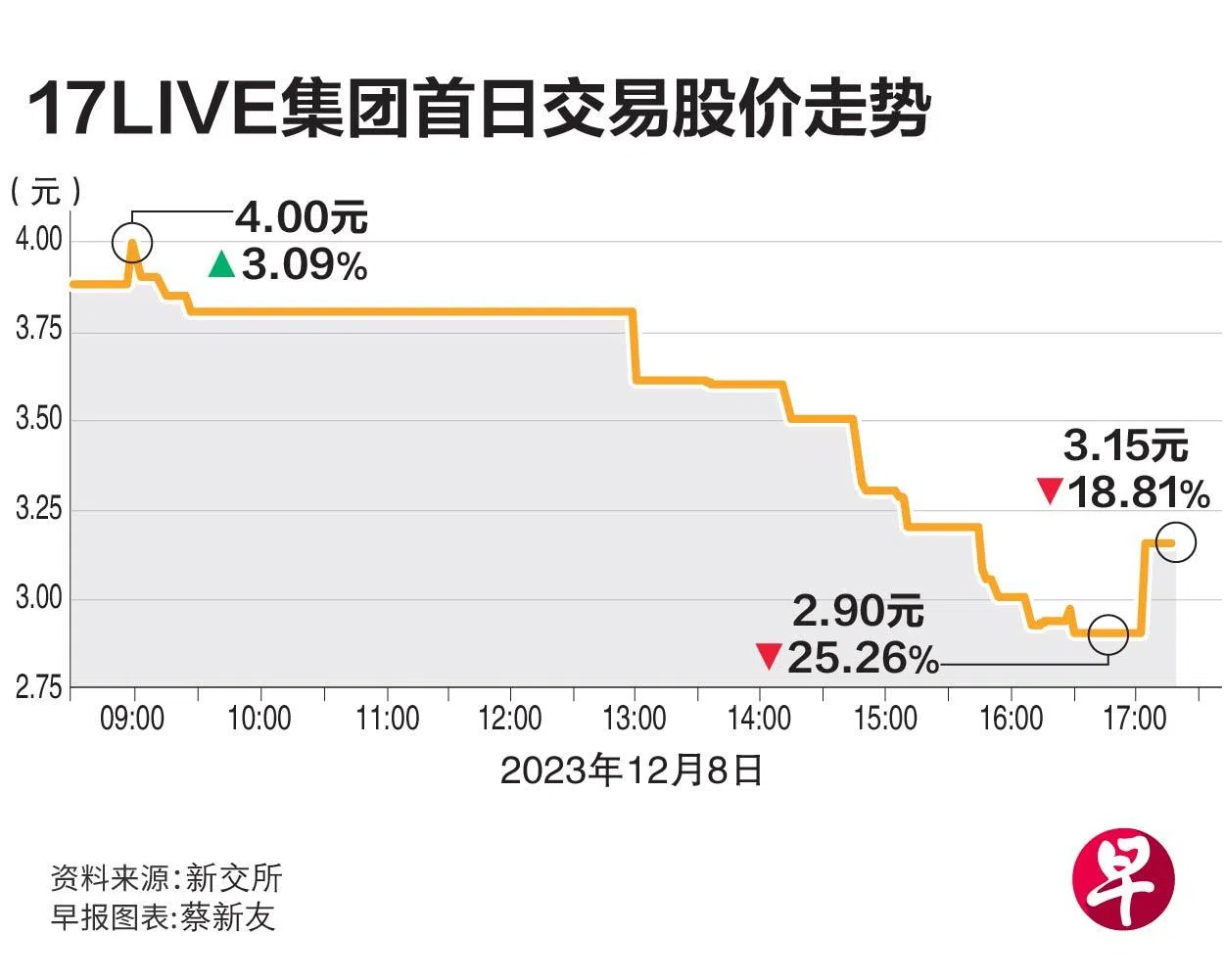 在区域直播业领军的17LIVE集团星期五(12月8日)首日交易股价一度大跌超过25%至2.90元,公司管理层受访时说,直播行业在本区域还是很新的东西,相信投资者需要一些时间去了解直播行业的增长速度和市场规模。希望公司的上市能够帮助创造环境,以便更多科技相关公司在新加坡上市。