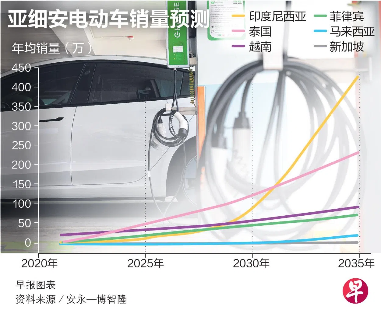 印尼是本区域最大的电动车市场,到了2035年,每年销量预计达到450万辆,销售额预计达到260亿美元至300亿美元。泰国紧随其后,销量预计为250万辆,销售额介于350亿美元至420亿美元。