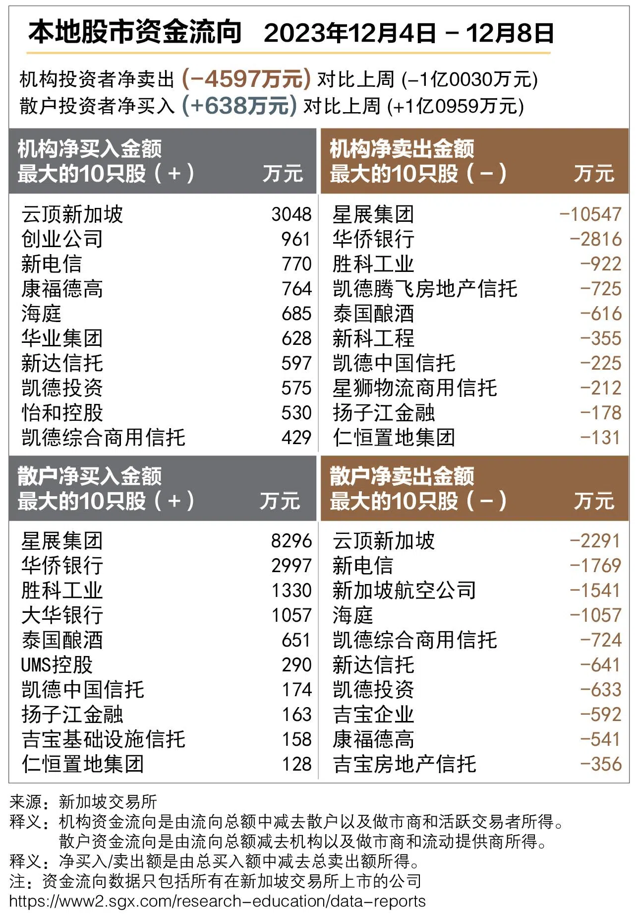 新交所数据显示,上周本地股市,机构投资者总共净卖出4597万元,他们净买入最多的是云顶新加坡(Genting Singapore),净卖出最多的是星展集团(DBS);散户则相反。