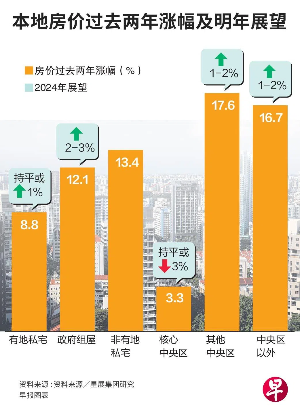 对于本地房产2024年展望,星展集团研究预测我国明年整体房价的增势趋缓,可能持平或上扬2%。基于新加坡整体失业率较低、抵押贷款利率稳定,以及组屋转售价格表现良好,组屋升级者将成为明年买家核心群体。执行共管公寓(EC)、中央区以外(OCR)及其他中央区(RCR)私宅,以及组屋转售市场成为亮点。