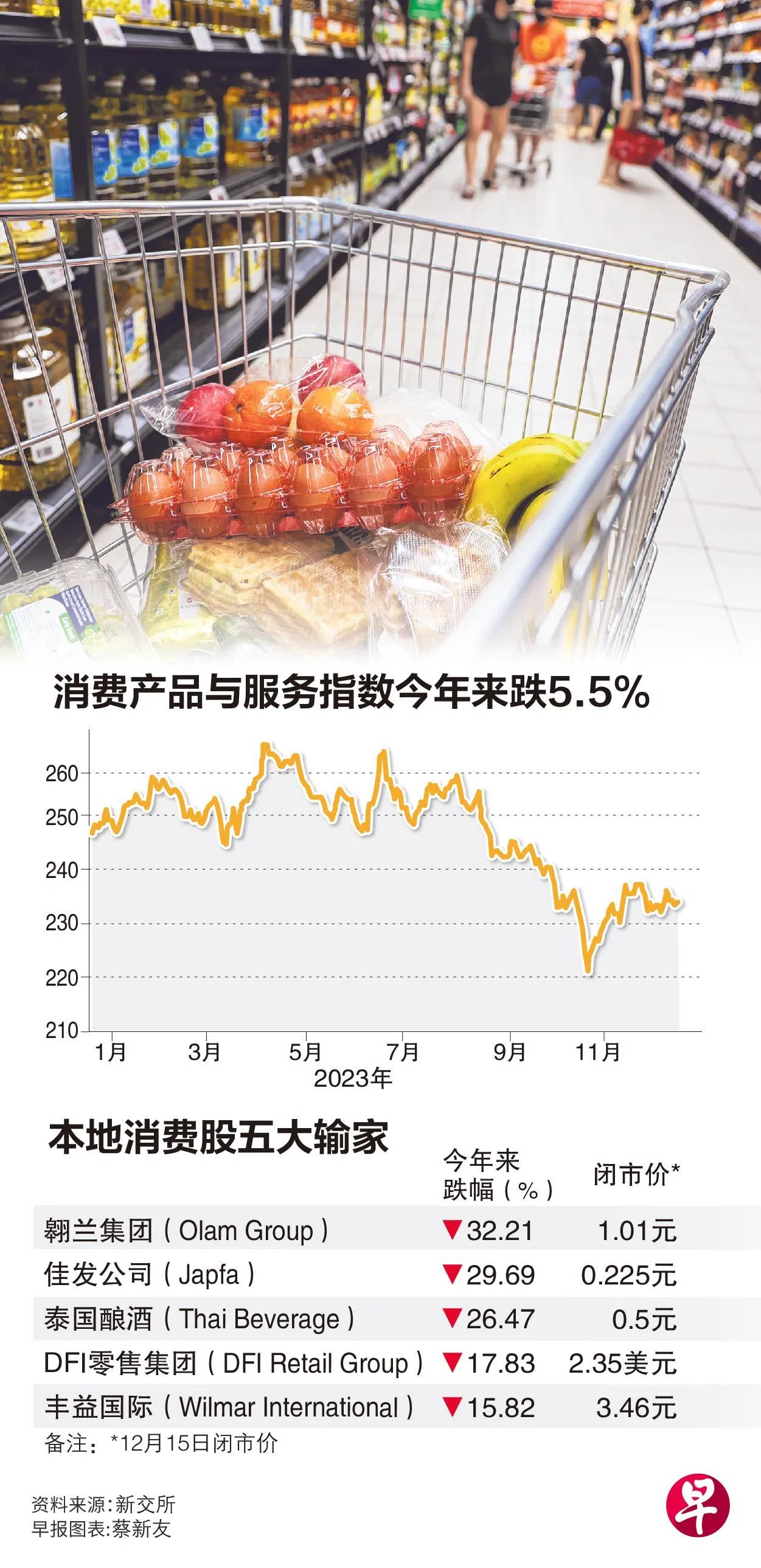 截至12月15日,由17只消费股组成的富时海峡时报消费产品与服务指数(FTSE ST Consumer Goods & Services Index)今年来下跌约5.5%。当中,翱兰集团(Olam Group)的跌幅最大,下挫32.21%。其次是佳发公司(Japfa)和泰国酿酒(Thai Beverage),分别跌29.69%和26.47%。