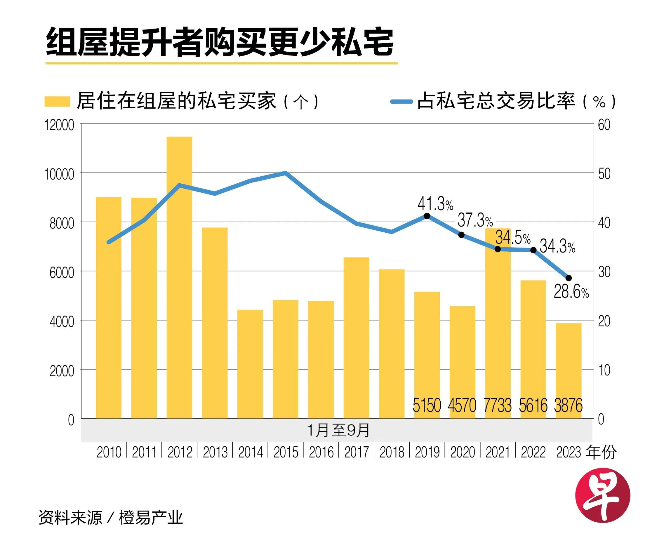 橙易产业早前发布的数据显示,私宅买家当中,组屋提升者的比率自2020年第三季开始下跌至目前的40%以下,而原地址是私宅的买家,比率则攀升至60%。