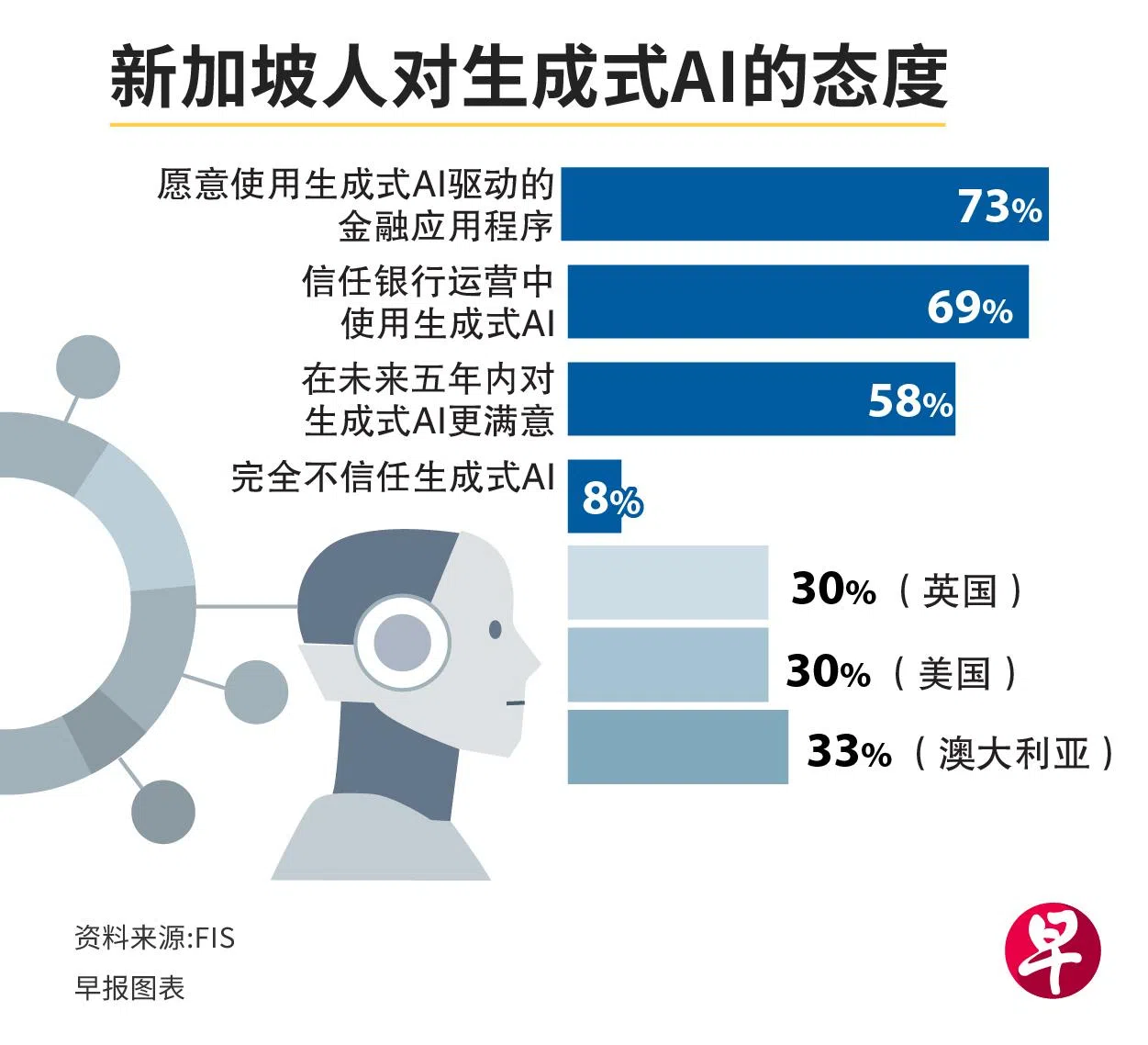 新加坡人在对生成式人工智能(AI)的熟悉度、使用经验和信任度方面,领先澳大利亚、英国和美国等主要市场。近四分之三的新加坡受访者指出,如果将来有一款生成式AI驱动的金融应用程序推出,他们将有兴趣使用。