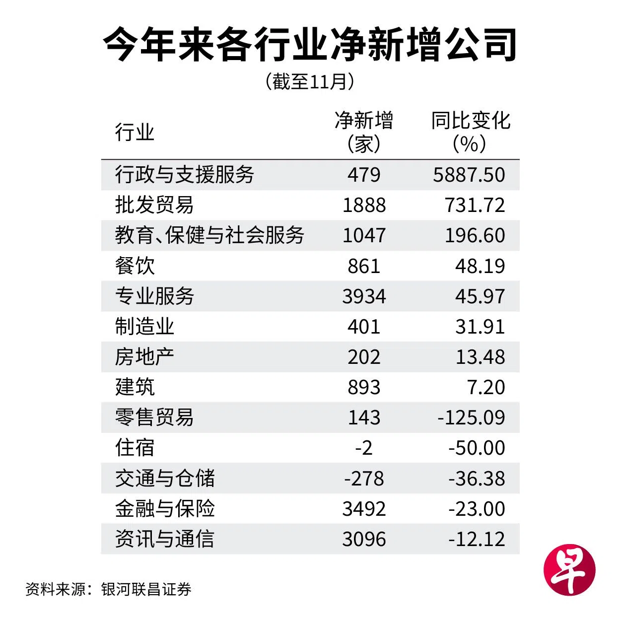 与去年同期相比,行政与支援服务、批发贸易、教育、保健与社会服务,以及餐饮服务业的公司增幅最明显。