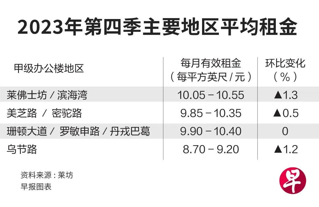 莱坊(Knight Frank)去年末发布的报告指出,本地办公楼的整体租金在2023年上半年稳步上升,但到了下半年,本地公司以业务持续性和营运稳定性为优先考量,致使租金增长放缓。
