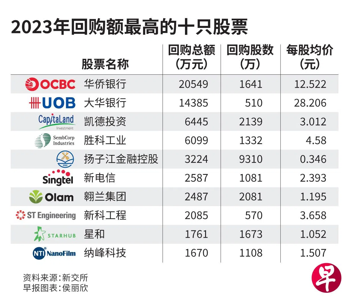 2023年,69家在新交所第一上市的公司进行了股票回购。回购股票最多的是华侨银行(OCBC),共回购2亿零549万元的股票。大华银行(UOB)和凯德投资(CapitaLand Investment)分别以回购1亿4385万元和6445万元,排名第二和第三。