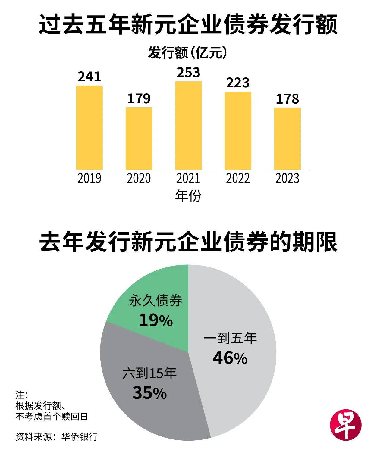 根据华侨银行近日发布的2024年上半年新加坡信贷展望报告,去年共有84批新元企业债券发行,总额为178亿元,这比起大受疫情冲击的2020年(179亿元)还低。