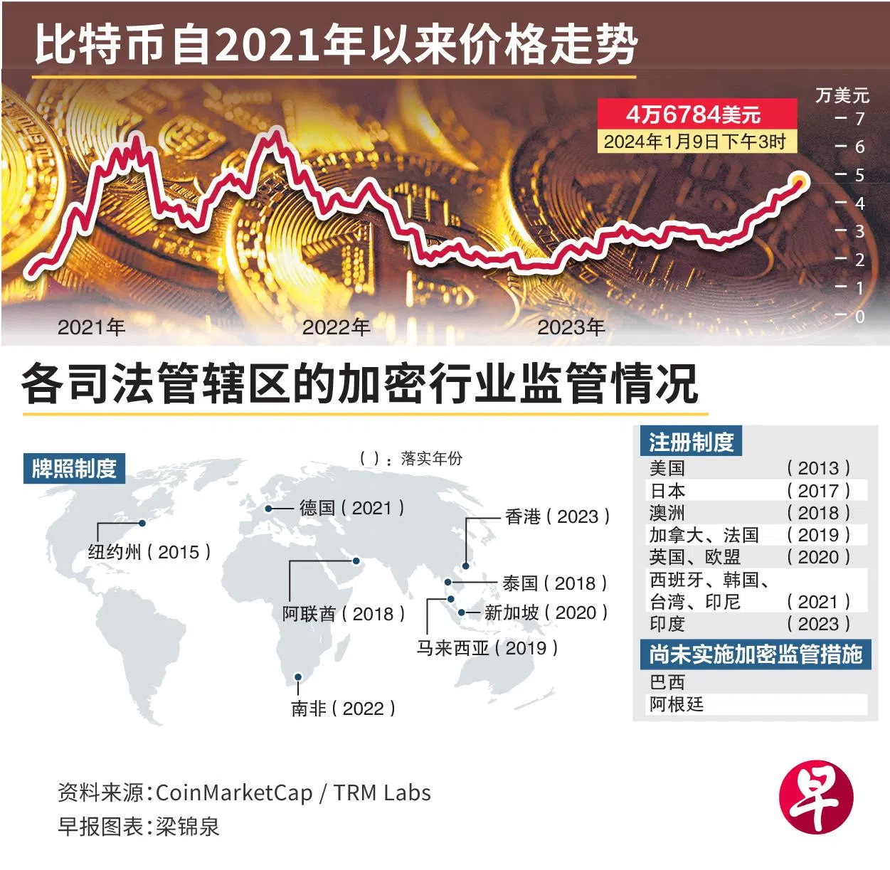 现货比特币交易所挂牌基金(ETF)能否在美国上市很快就揭晓,市场看涨情绪推动全球市值最大加密货币——比特币星期二(1月9日)盘中一度升上4万7000美元(近6万2500新元),创两年来最高位。