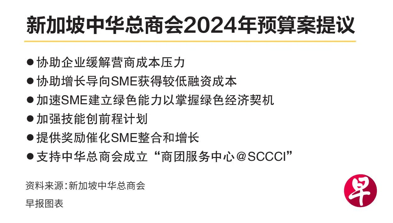 中华总商会也列出六项针对今年财政预算案的提议。它期望预算案能协助商家缓解营商成本、协助增长导向企业获取较低融资成本、加速中小企业建立绿色能力以掌握绿色经济的契机、加强技能创前程(SkillsFuture)计划以支持员工掌握精深技能和能力、提供奖励催化中小企业整合和增长、以及支持中华总商会推出“商团服务中心”以更好地支持领域转型和发展。