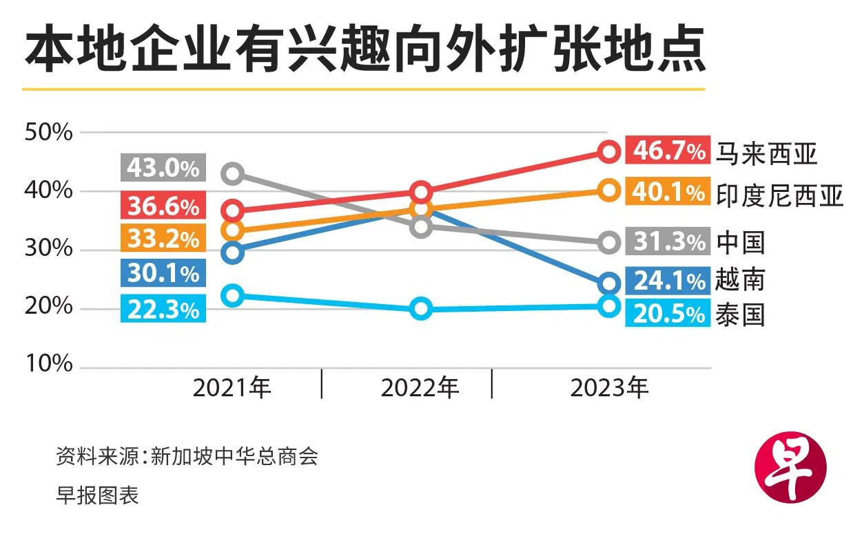 不过,本地企业对中国和越南的兴趣递减。有意到中国发展的企业占比,从2021年的43%,滑落至去年的31.3%。此外,有意到越南拓展业务的本地企业占比,也从2022年的37.2%,大幅跌至24.1%。