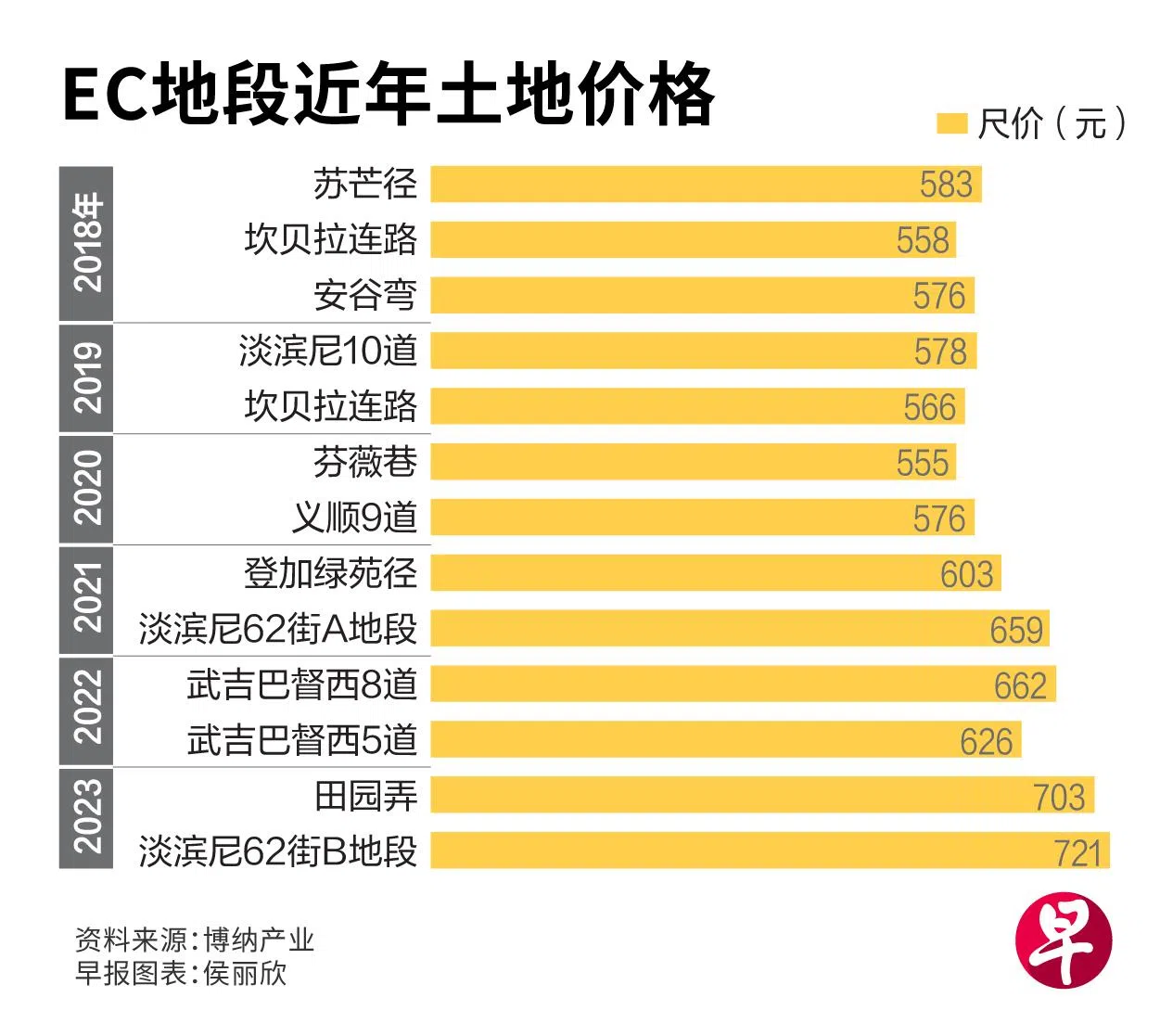 2018年,位于苏芒径(Sumang Walk,现星水嘉园项目)的EC地段每平方英尺容积率价格达583元,创下当时EC最高地价纪录。之后,纪录多次改写,去年10月,淡滨尼街62街B地段再创新高,尺价达721元。