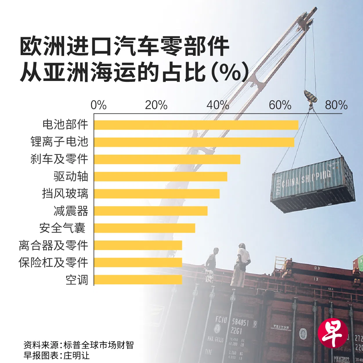 此外,汽车行业也有曝险,不少车商零部件采纳“时间刚好”(just-in-time) 的供应策略,难以应付多日延误。截至去年9月底的12个月内,欧洲进口汽车零部件之中,从亚洲海运送抵的电池部件及锂离子电池超过六成。