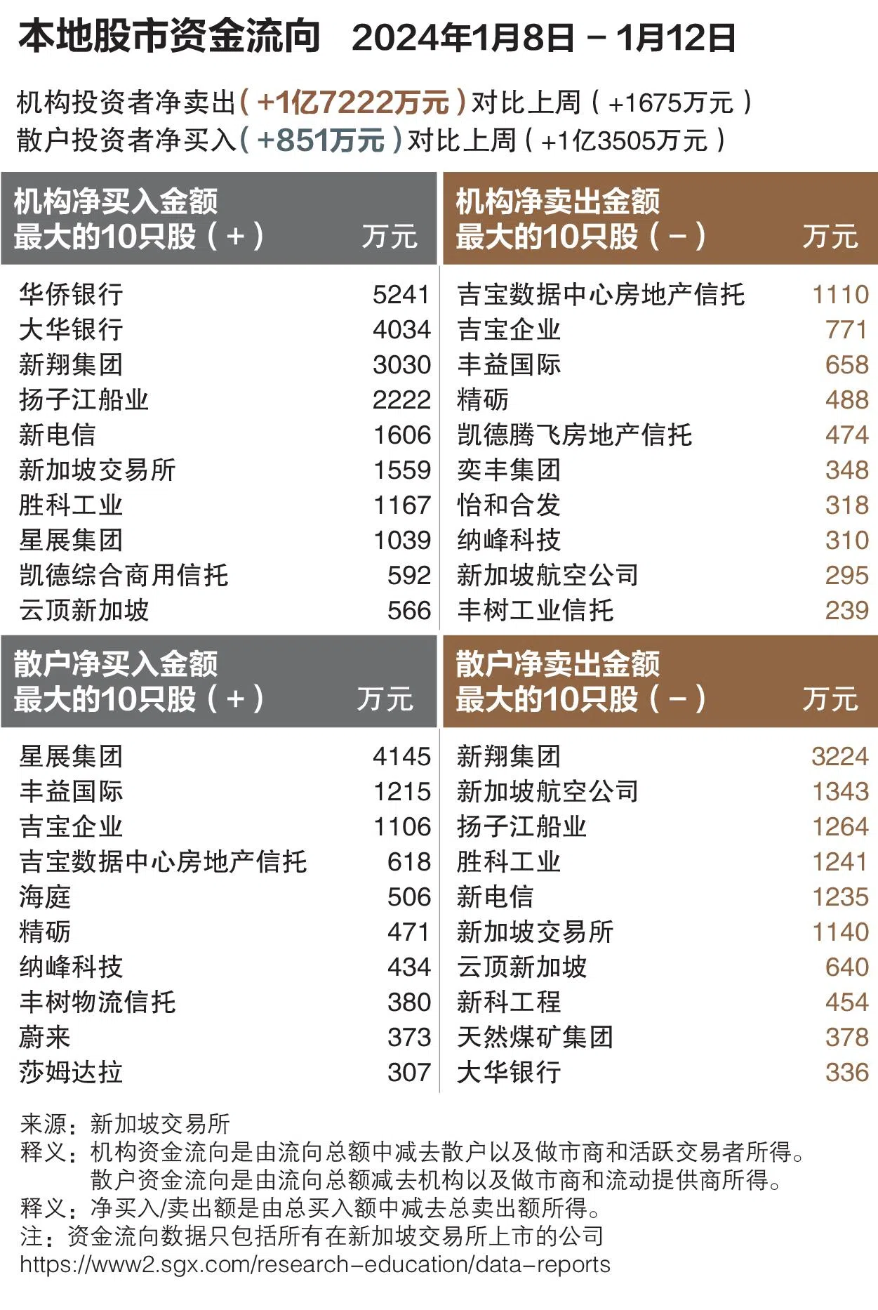 机构投资者在上周净买入1亿7222万元的股票,比前一周多出1675万元,净买入金额最高的股票为华侨银行(OCBC),净卖出金额最高的是吉宝数据中心房地产信托(Keppel DC Reit)。