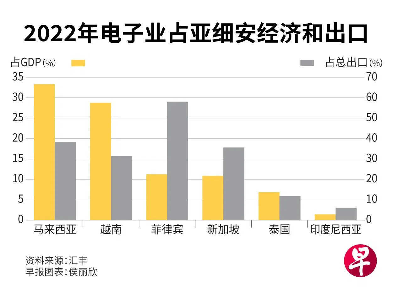汇丰全球研究(HSBC Global Research)经济师刘韵在最新发布的报告中指出,最近的一些指标显示,科技生产强劲回弹,与全球半导体供应链高度挂钩的新加坡、马来西亚和越南可把握科技业的回弹。数据显示,电子业占多个亚细安国家国内生产总值(GDP)比重高,并且出口显著。