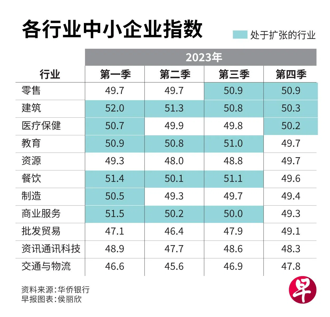 去年第四季处于扩张的是零售业(50.9)、建筑业(50.3)和医疗保健业 (50.2),而当中的医疗保健业是连续萎缩两季后再度步入扩张区域。教育业(49.7)、餐饮业(49.6)和商业服务(49.3)则在扩张多季后陷入萎缩。