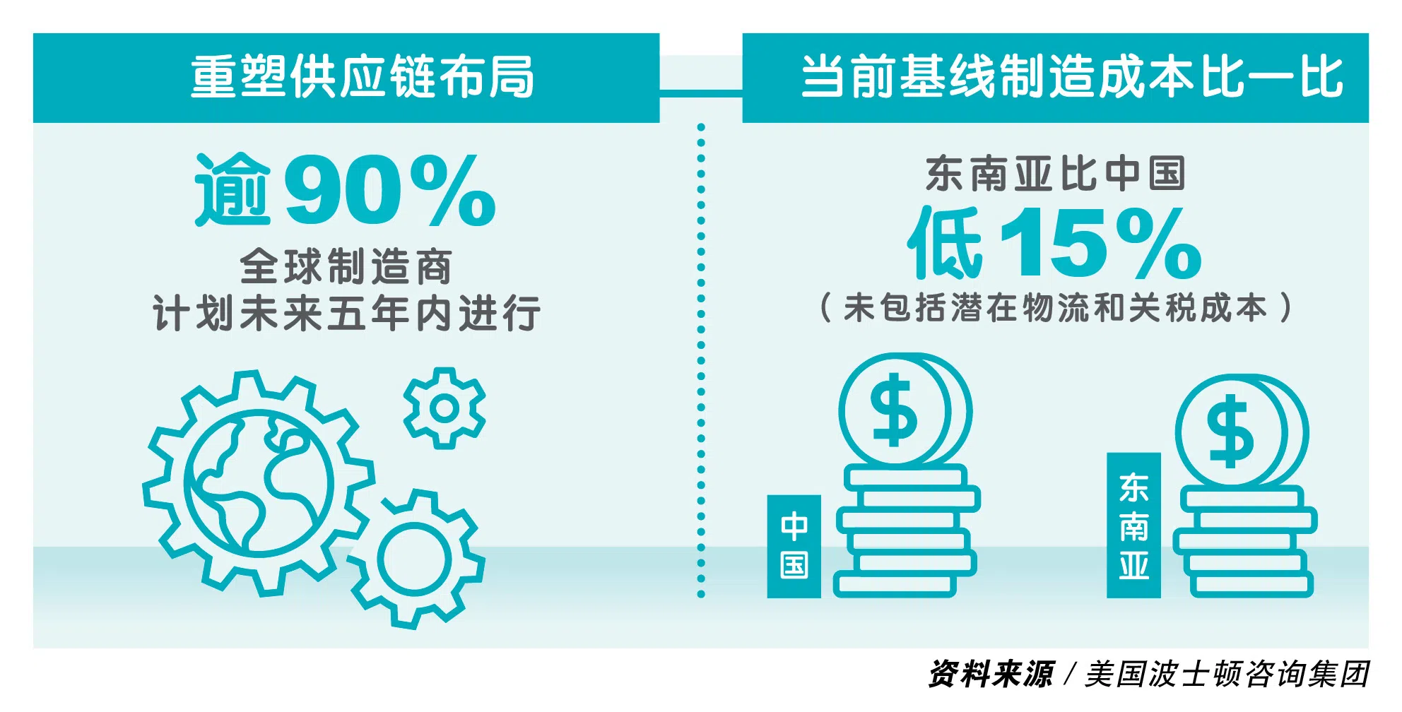 根据美国波士顿咨询集团(Boston Consulting Group,简称BCG)的评估,东南亚的基线制造成本现在比中国低15%,这还未把潜在物流和关税成本考虑在内。