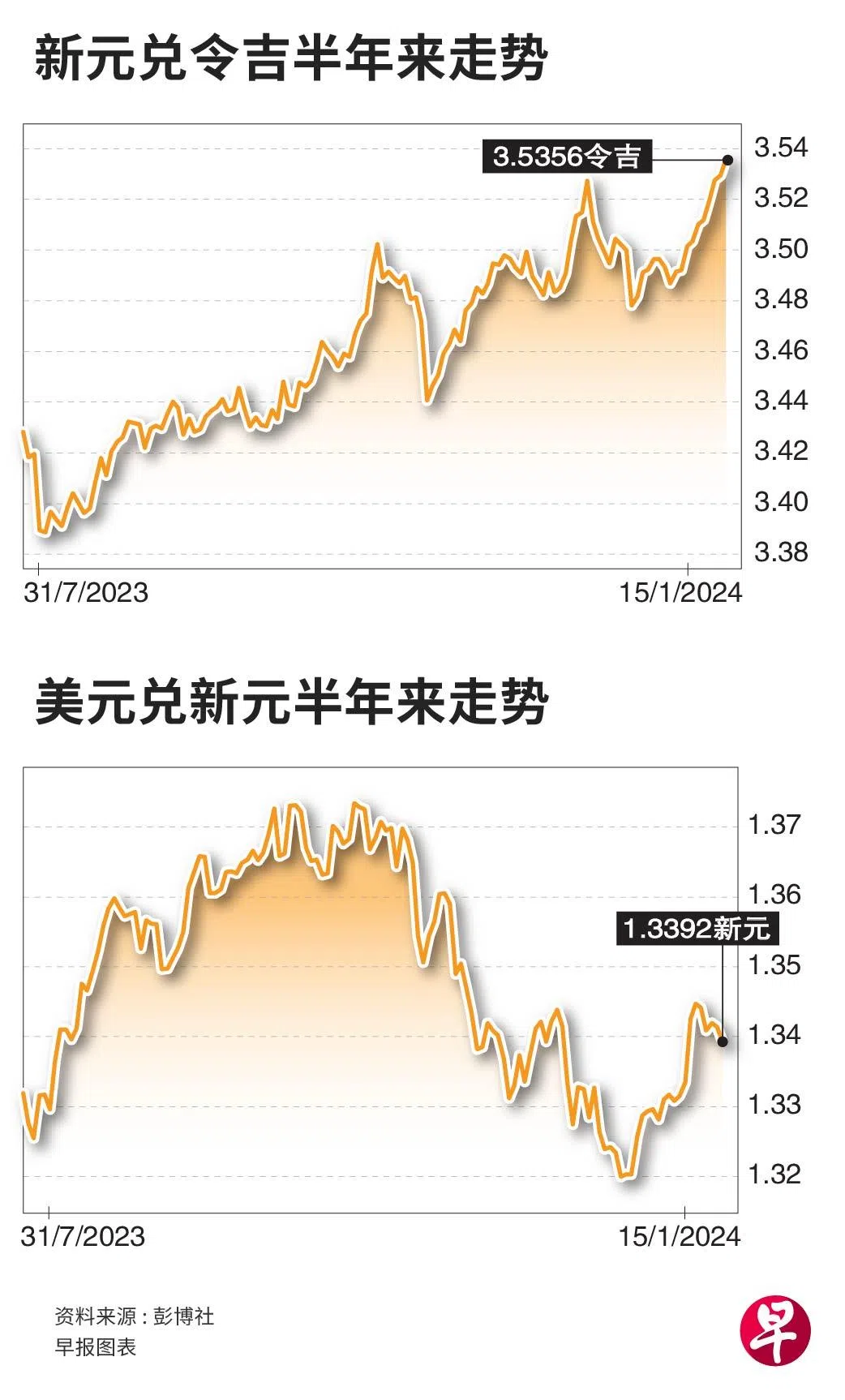 近日新元走强,星期三(24日)新元兑令吉继续攀高,一度去到3.5357的高点,美元兑新元汇率从1.34以上下滑到1.33水平。