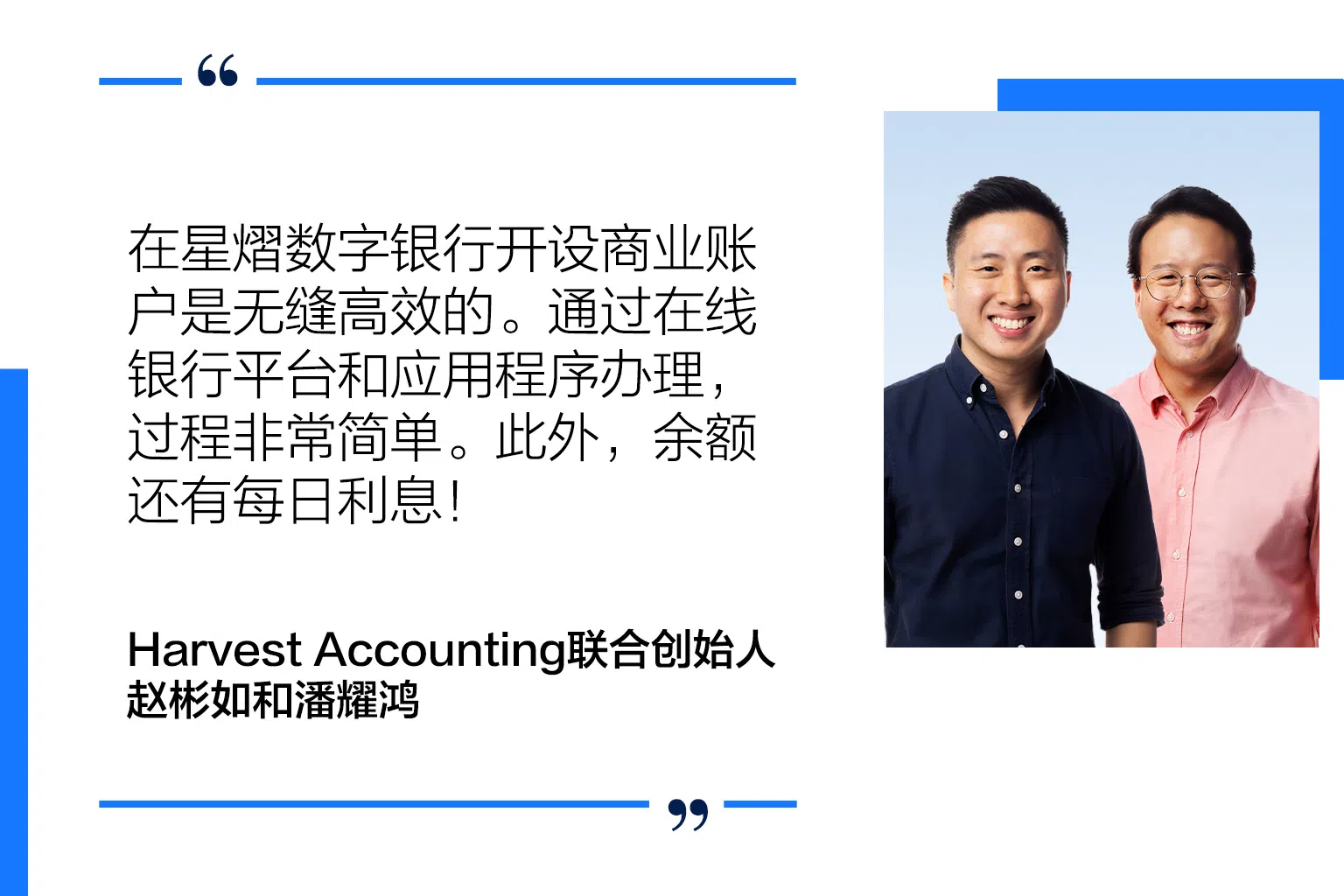 支持中小企业远程开户:星熠数字银行洞悉中小企业拓展海外市场的痛点,率先为中小企业提供远程开户服务的创新。只要在新加坡注册的公司,无论业务开展地于何处,均可通过便捷简单的线上流程,轻松无缝地开立商用账户,获取融资及定期存款。这个便利支持了中小企业的发展和国际化,实现跨境互联互通,无论身处何地,都可享受银行便捷的金融服务。