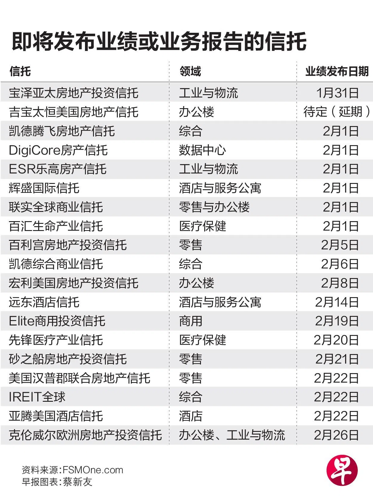 吉宝房地产信托(Keppel REIT)、凯德中国信托(CapitaLand China Trust)和城市发展酒店服务信托(CDL Hospitality Trusts)星期二(1月30日)开市前发布截至去年12月底的最新业绩。