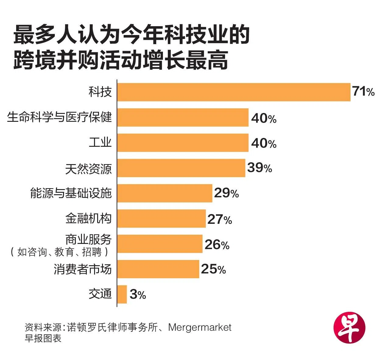 根据调查,71%受访者预期今年科技业的跨境并购活动增长最高,其次是生命科学与医疗保健(40%)、工业(40%)、天然资源(39%),以及能源与基础设施(29%)。