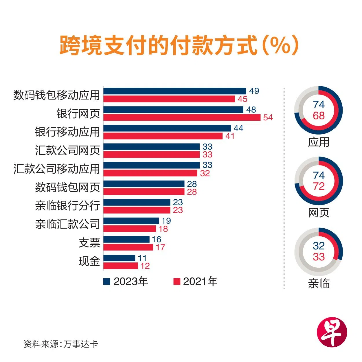 目前,数码钱包移动应用是最多中小企业使用的跨境付款方式,从2021年的45%增加至去年的49%,取代原来最常使用的银行网站。通过银行网站付款则从2021年的54%下降至去年的48%。