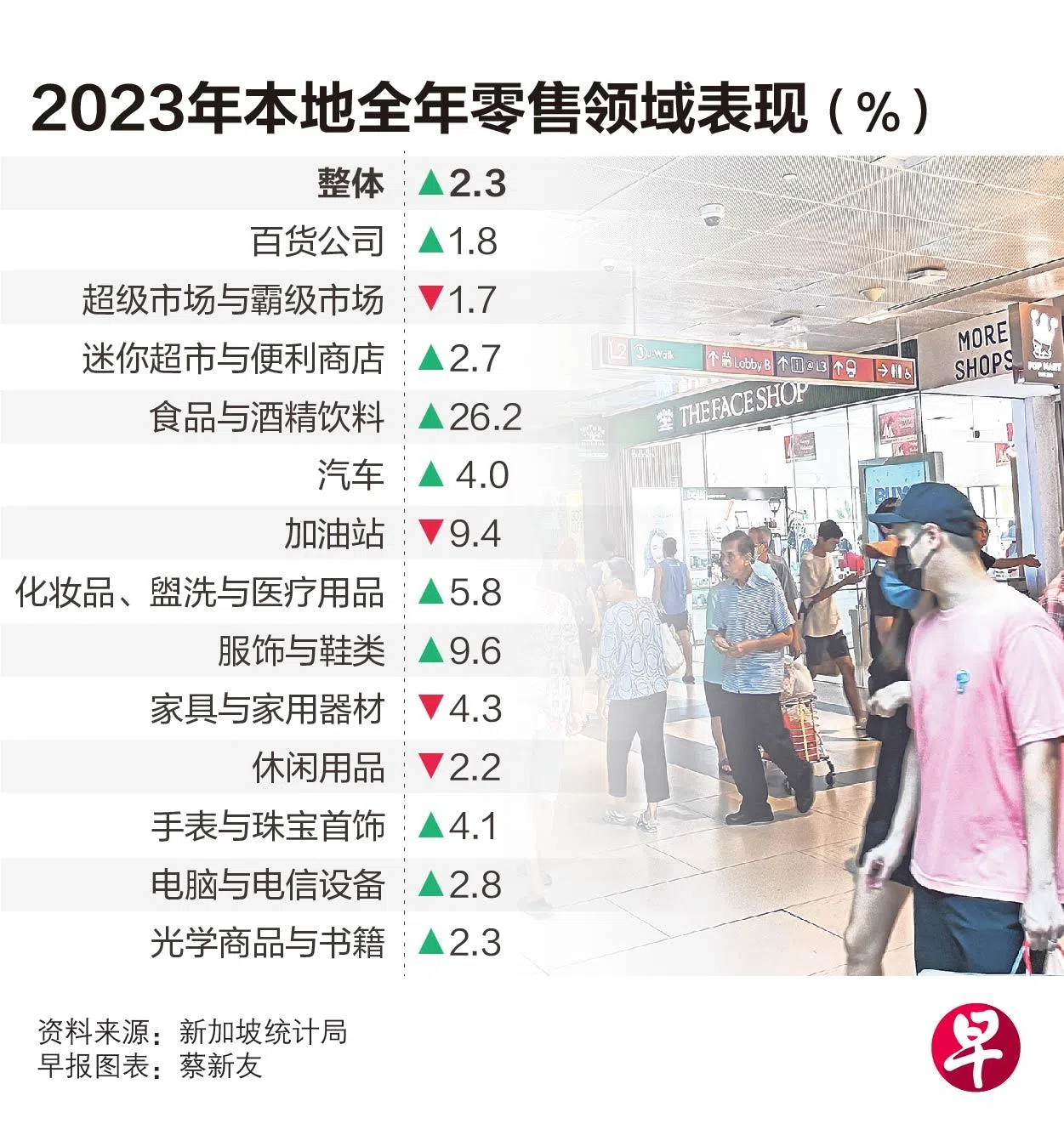 新加坡统计局星期一(2月5日)发布的零售销售指数显示,如果不包括汽车销售,12月零售销售指数同比下跌2.7%。经季节性调整,12月零售销售指数环比下跌1.5%,逆转了11月0.5%的涨幅;若不包括汽车销售,则环比下跌3%。