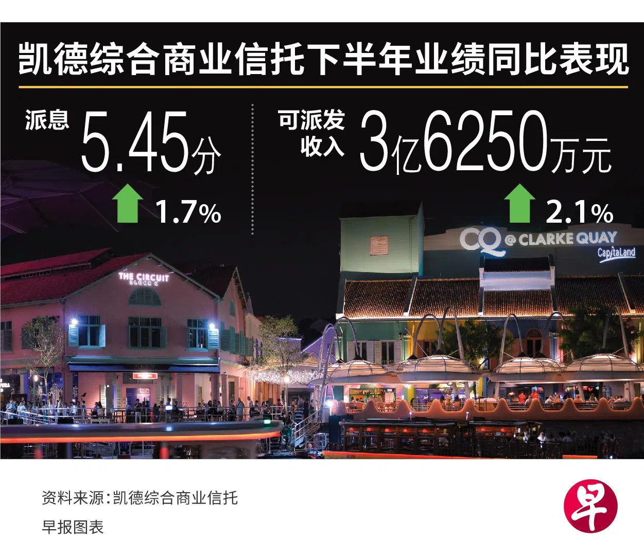 凯德综合商业信托(CapitaLand Integrated Commercial Trust)去年下半年的每单位派息(DPU)增加1.7%至5.45分,派息日为3月28日。