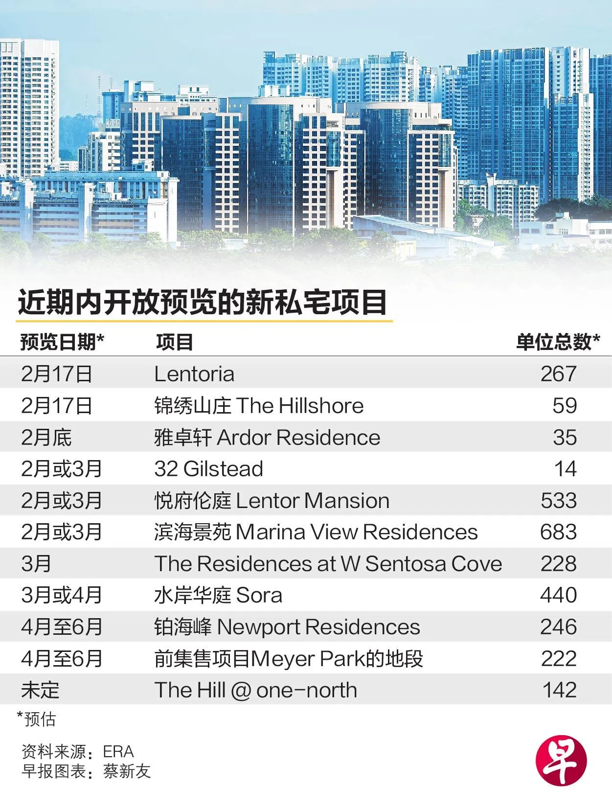 根据房地产经纪公司ERA提供给《联合早报》的数据,农历新年假期之后,率先开放示范单位的新私宅项目包括Lentoria和锦绣山庄(The Hillshore),预计从2月17日起展开预览活动,并从3月2日起接受预订。